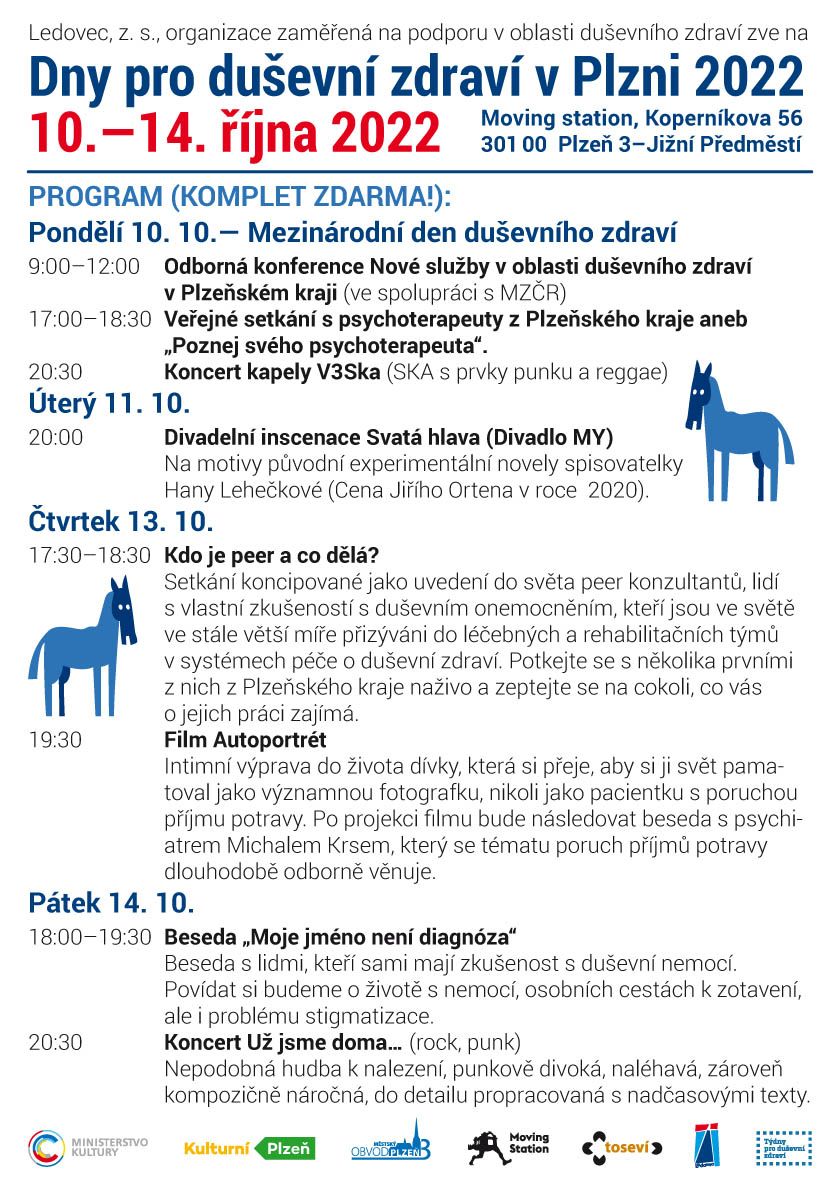 Dny pro duševní zdraví v Plzni letos proběhnou od 10. 10. do 14. 10. 2022 v prostoru Moving Station na Jižním Předměstí. Kulturně-vzdělávací pásmo setkání profesionálů a široké veřejnosti, diskusí, koncertů, filmu i divadla informuje o nejrůznějších aspektech duševního zdraví, prevenci i konkrétních službách péče pro lidi s duševním onemocněním.